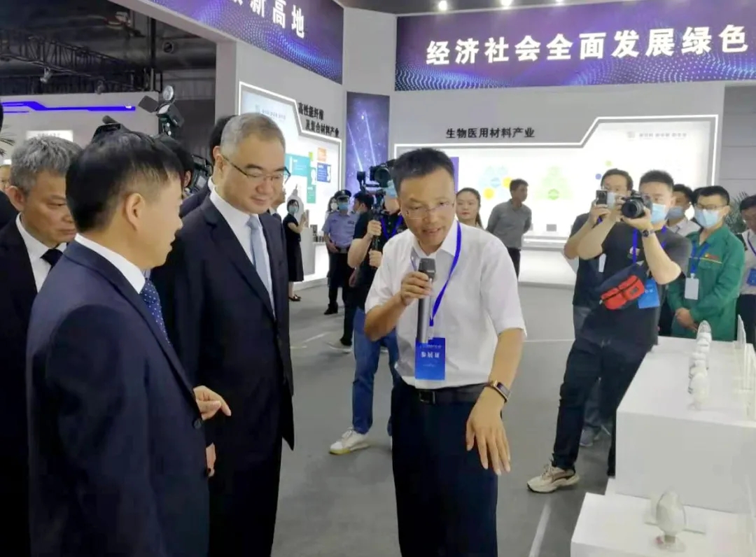 在展会上,高申保向省长王清宪,省委常委、常务副省长、省政协副主席邓向阳等省领导详细介绍了尊龙凯时近年来高速发展及产业布局情况。公司始终重视新材料的发展,坚持围绕PVA主业,不断延伸产业链、拓宽产业面,增加产品附加值与科技含量,打造了可再分散性胶粉、PVA高强高模纤维、PVA光学膜、PVB胶片等拥有自主知识产权的新材料产品。